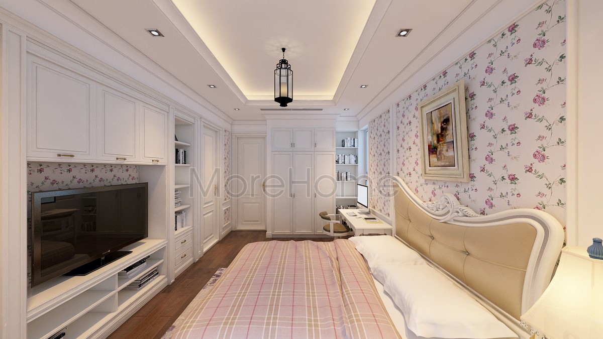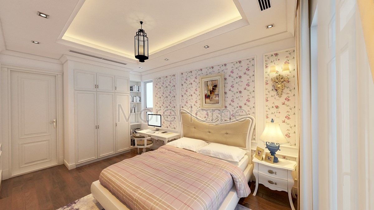 Tiếp đến là không gian phòng ngủ con gái, giấy dán tường hoa với gam hồng nhẹ thể hiện nét nữ tính nhưng không quá sến. Chiếc giường ngủ đơn được thiết kế đơn giản bài trí chính giữa . Trông không gian này có sự xuất hiện của chiếc tủ quần áo cánh trượt cùng nhiều ngăn, với nhiều kệ được phân chia thích hợp bên trong sẽ mang đến sự thoải mái và tiện nghi cho bé khi sắp xếp và bảo quản quần áo cũng như các đồ dùng cá nhân khác.