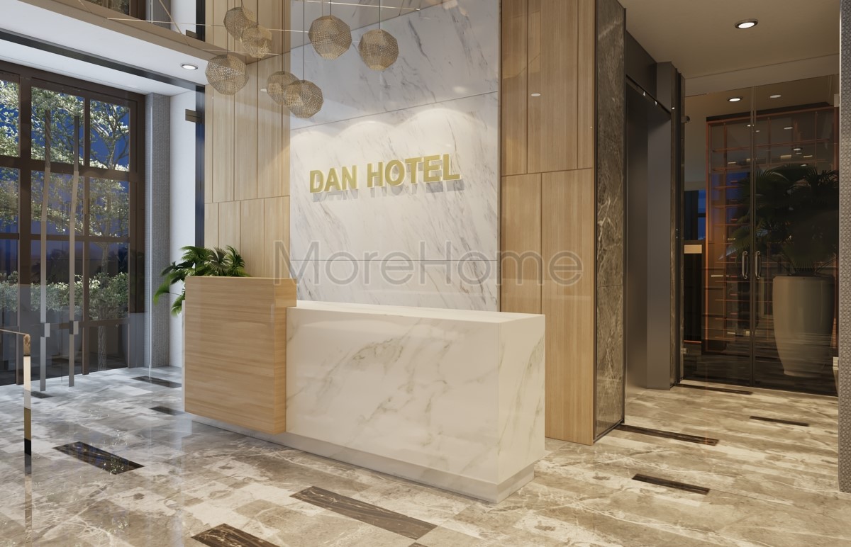 Sảnh khách sạn là nơi đón tiếp khách hàng do đó việc thiết kế một không gian sảnh sang trọng, chuyên nghiệp chính là chìa khóa thành công của đơn vị kinh doanh dịch vụ này. Bằng cách sử dụng chất liệu kính ốp trần tạo không gian mở rộng cả về chiều cao, chiều sâu và chiều rộng. Với tên thương hiệu “Dan Hotel” trên nền đá ốp tường sảnh, cùng với gỗ ốp tường. Quầy lễ tân chữ I được thiết kế đồng bộ với mảng tường phía sau cũng sử dụng đá nhân tạp và gỗ ốp, tạo sự tiếp xúc gần gũi giữa nhân viên với khách hàng lại không làm không gian trở nên chật hẹp.
