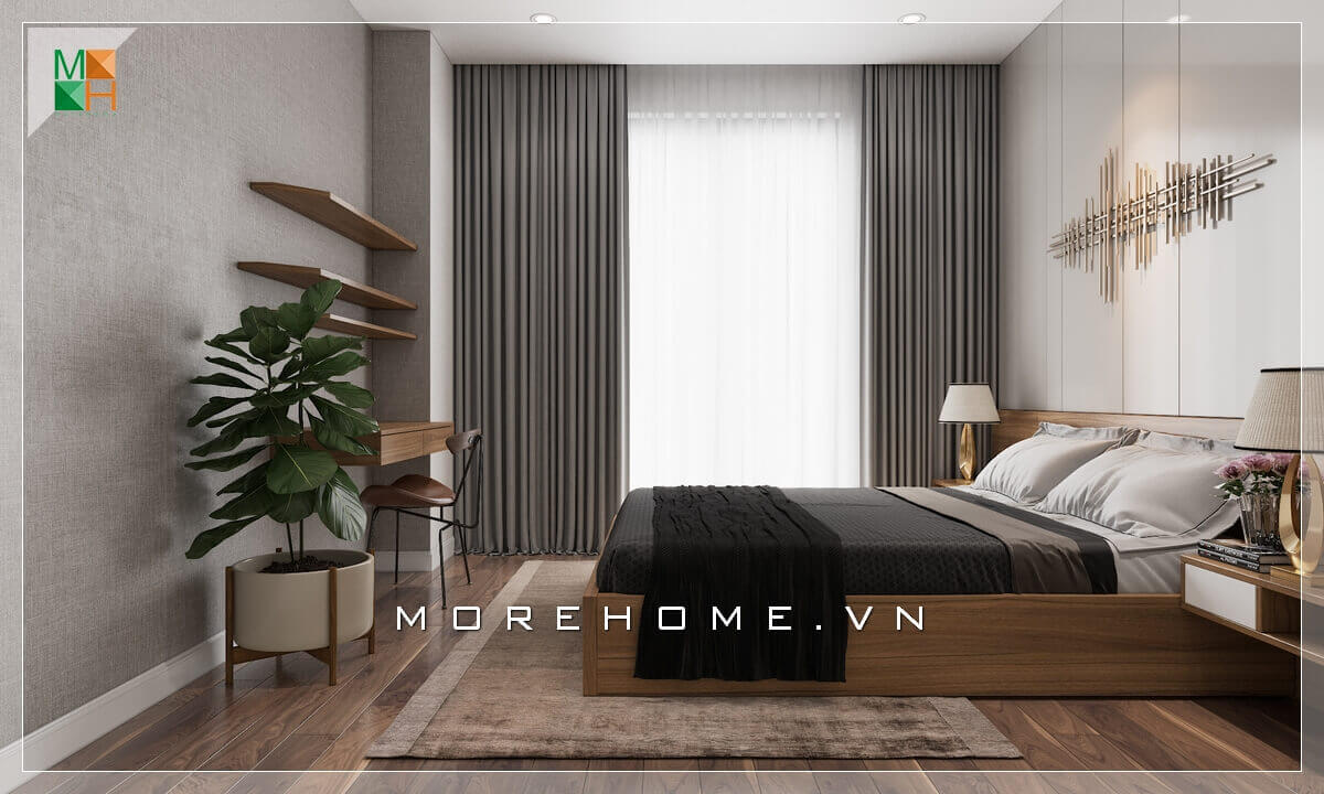 Mẫu thiết kế nội thất phòng ngủ đẹp phong cách đơn giản hiện đại, ấn tượng với thiết kế kệ gỗ dài đầu giường được thiết kế gọn gàng, thông minh và sáng tạo.