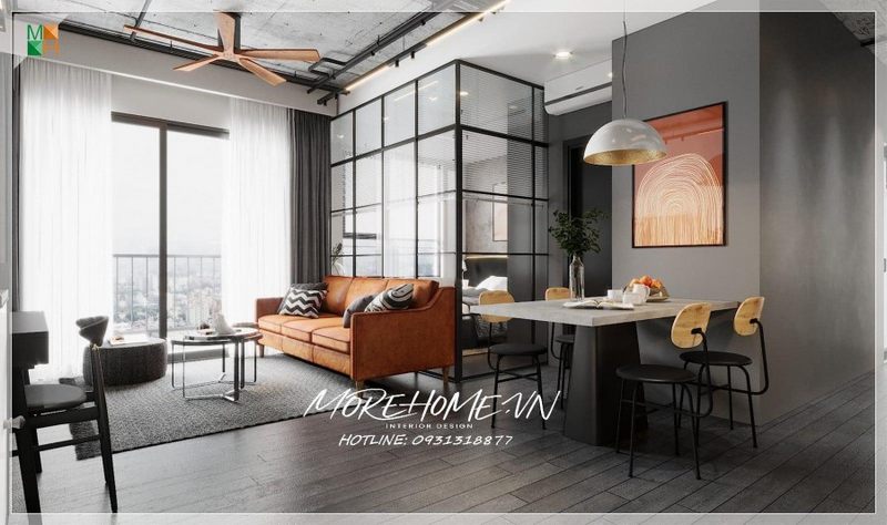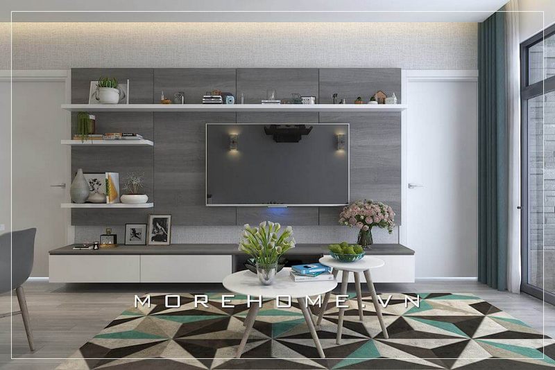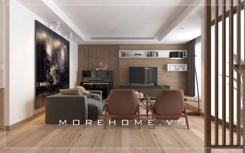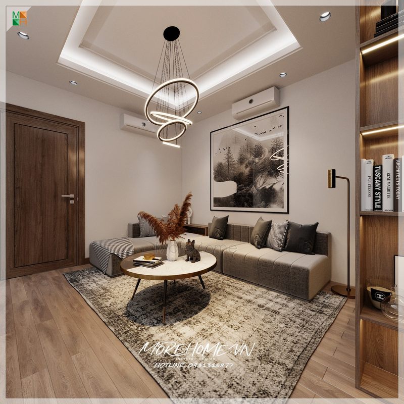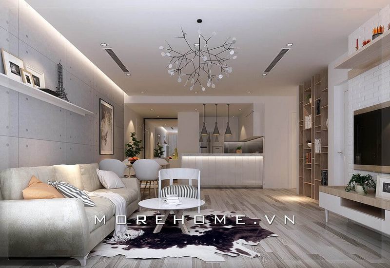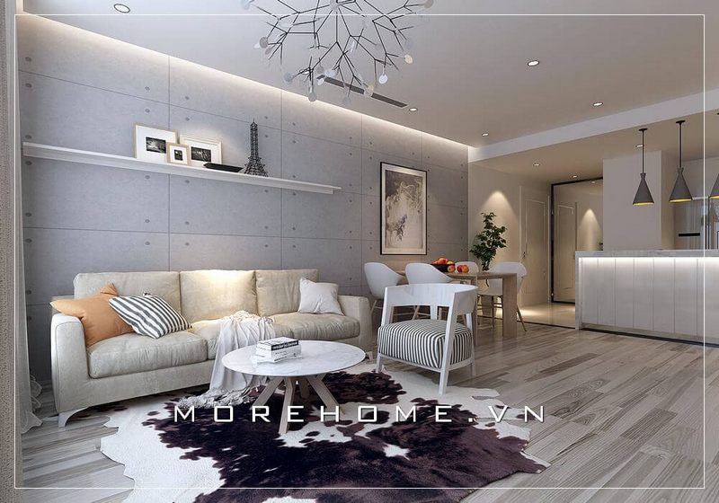 Mẫu thiết kế phòng khách chung cư đẹp, các kiến trúc sư Morehome sử dụng các hình khối đơn giản và cụ thể mang đến sự rõ ràng và thuận tiện cho gia chủ