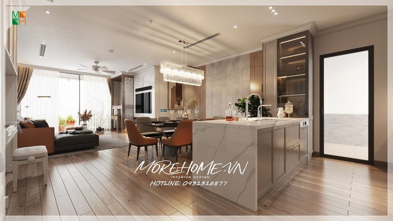 Các kiến trúc sư MoreHome giới thiệu mẫu thiết kế nội thất phòng bếp liền phòng khách cho chung cư có hệ thống tủ bếp chia nhiều ngăn để đồ và quầy bar trẻ trung kết hợp làm bàn ăn