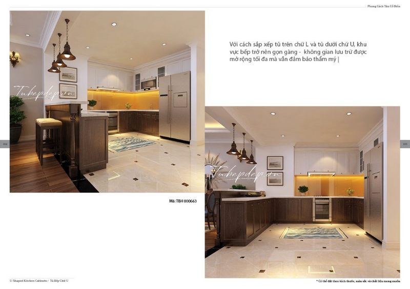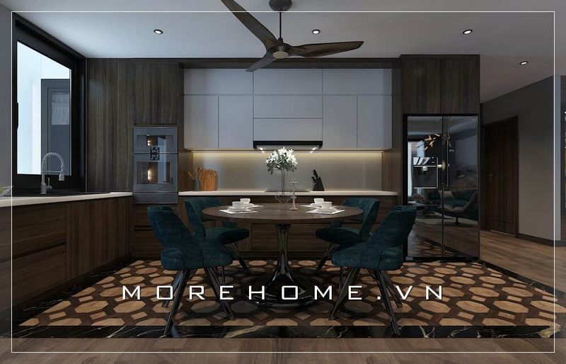 Tủ bếp chữ U cao cấp cùng với bàn đảo ở giữa giúp các bà, các mẹ có thể nấu nướng và di chuyển dễ dàng hơn, giúp các bữa ăn được chuẩn bị nhanh chóng và đầy hương vị ngon miệng hơn.